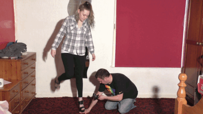 Mistress Sophie was dressing as she got ready for the wild night she had planned with her friends. On her mirror, she saw a camera popping by the door, and she went and opened it wide and found her brother recording her. She questioned him, and he said that he was curious and wanted to see what her body looked like. She got so man at him, and she trampled on his hands, making sure he doesn't hold the camera again anytime soon